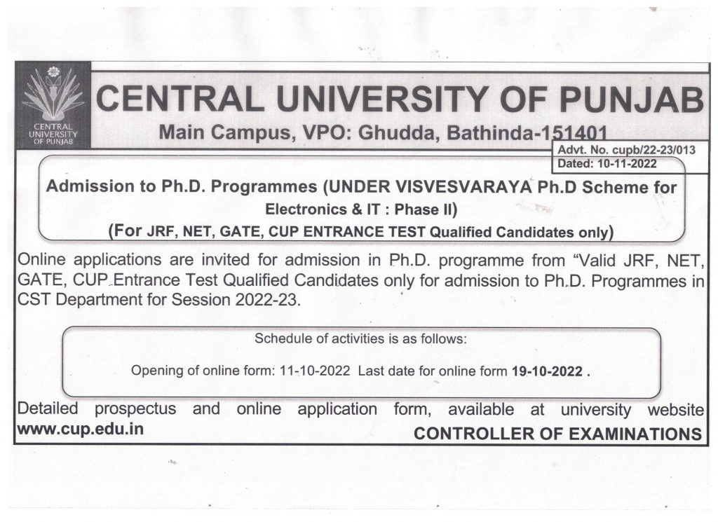 Important Dates for Central University of Punjab PhD Admission 2022 (July)