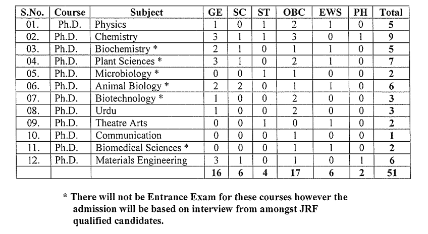 Ph.D.Plant SciencesWith at least 55% marks in M.Sc. in any branch of Life Sciences or M.Tech. in Bioinformatics/Biotechnology.PhD admission have both an entrance exam followed by an interview. Candidates qualified for JRF from CSIRUGC/ICMR/DBT will be exempted from the written test and allowed to appear for the interview.